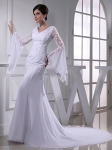 Cheap Column V-neck Lace Chiffon Wedding Dress With Long Sleeves