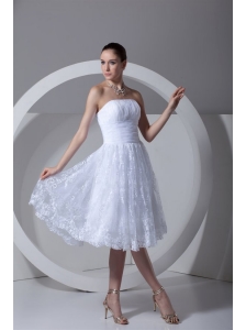 A-Line Strapless Tea-length Lace and Ruching Wedding Dress