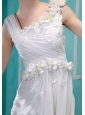 An absolutely perfect gown when looking your best is a must in your special day. One shoulder is highlighted with the ruches and throughout the bodice.The gorgeous hand made flowers decorate the left strap and all-over the waistline. A hidden side zipper up back makes for easy off and on and secures the dress in place. The stylish skirt is complete with a brush train.