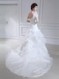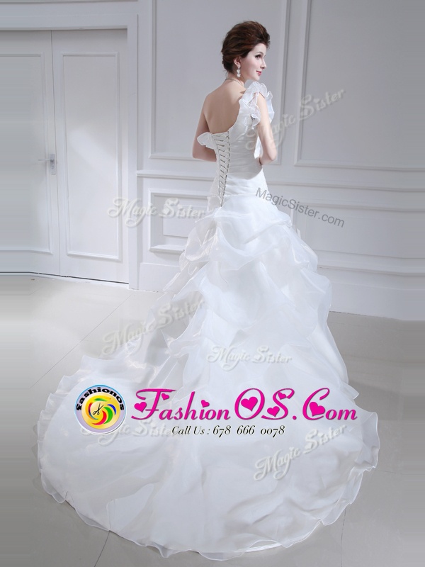 White A-line One Shoulder Sleeveless Organza and Tulle With Brush Train Lace Up Ruffles and Ruching and Pick Ups Wedding Dresses