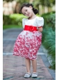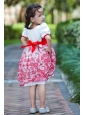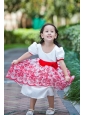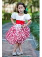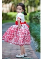 This pretty little girl dress features a simple and easy bodice. A coordinating red flower waist sash adds interest and detail to the mid-section of the dress. Soft chiffon creates an interesting handkerchief hem. The lovely short skirt is encrusted with red embroidery.