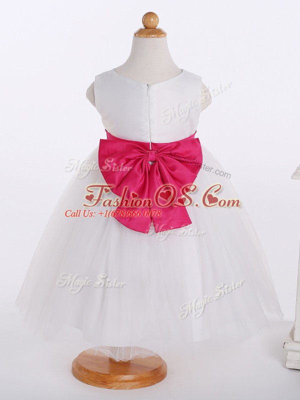 Home >  Special Occasion Dresses >  New Style Little Girl Pageant Dresses > White A-line Scoop Sleeveless Tulle Knee Length Zipper Bowknot and Hand Made Flower Little Girls Pageant Dress