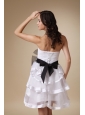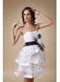 You will be the shinning star when you are in this fantastic short wedding dress. It features a ruched bodice with a banded waist where there is a big black and white flower on the right. The short skirt is made of multiple layers of lightweight hem-trimmed organza that allow you to move beautifully when you dance. A corset-style closure secures the dress in place and ensures a great fit.