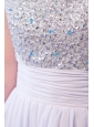 This white prom dress will show your fun side! The spaghetti straps and bust overflowing with shining beading tends to show off a well-toned body. A coordinating waist sash adds interest and detail to the mid-section of the dress. The mini-length airy chiffon skirt sways beautifully across the floor when you move, as if you're floating on air. This simple design never make you sacrifice your elegance and sensuality!