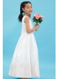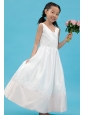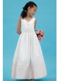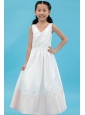 White A-line V-neck Flower Girl Dress Ankle-length Satin Appliques