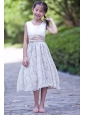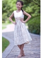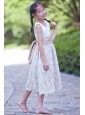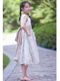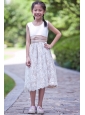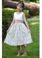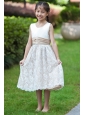 White and Champagne A-line Scoop Flower Girl Dress Tea-length Taffeta and Lace