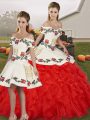White And Red Ball Gown Prom Dress Military Ball and Sweet 16 and Quinceanera with Embroidery and Ruffles Off The Shoulder Sleeveless Lace Up