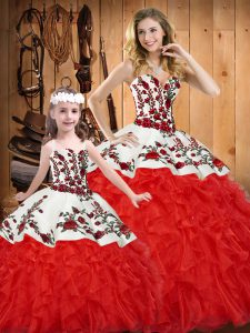 White And Red Sweet 16 Dresses Military Ball and Sweet 16 and Quinceanera with Embroidery and Ruffles Sweetheart Sleeveless Lace Up