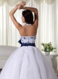 This ball gown comes in a pure white hue that keeps you shining at the center of it all! The halter neckline displays a pretty view of your neck and shoulders, and blue embroidery throughout the bodice and skirt emits a warm sparkle with amber accent stones. The ballroom skirt has a little bit of embroidery and a bow on the waist feature the design perfectly!