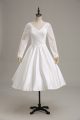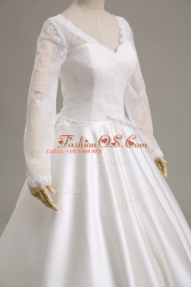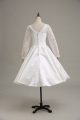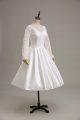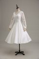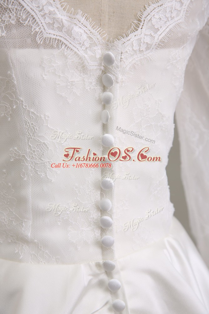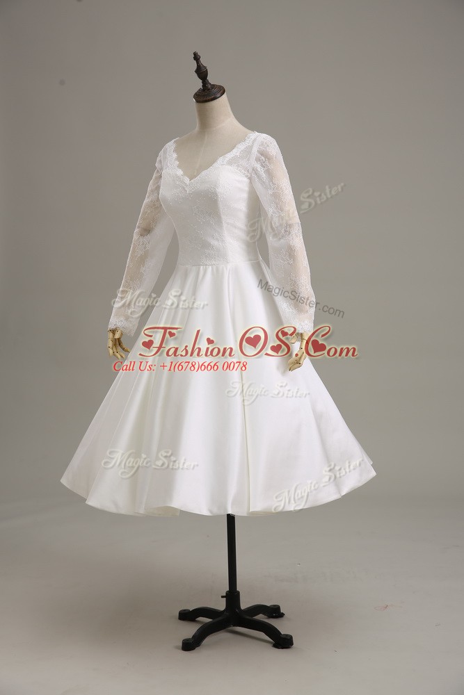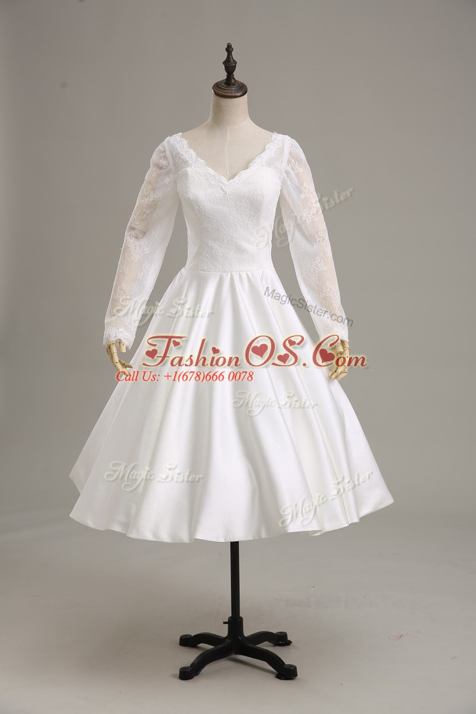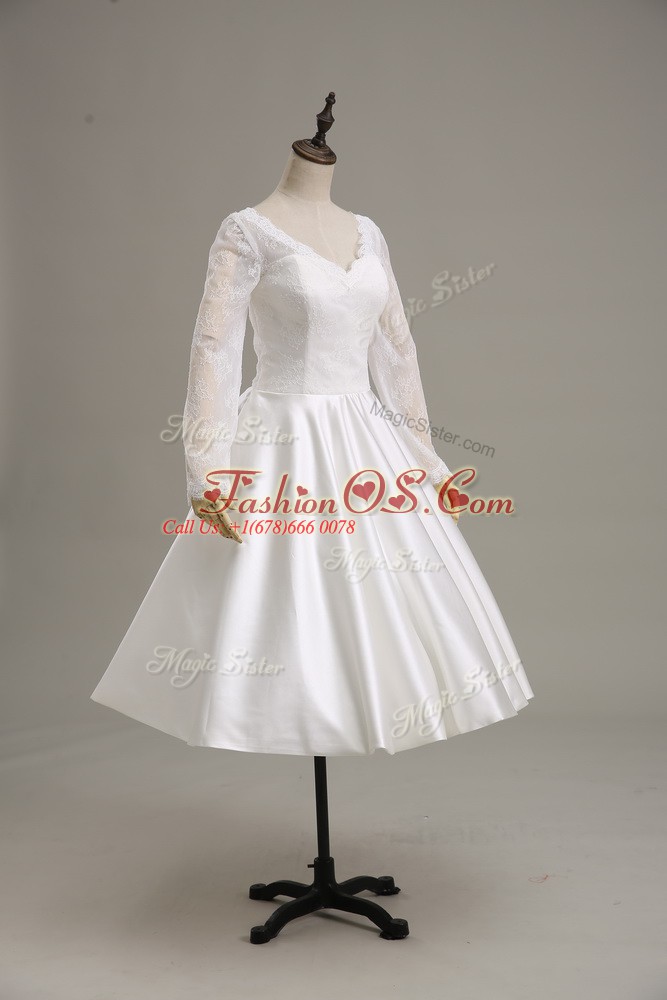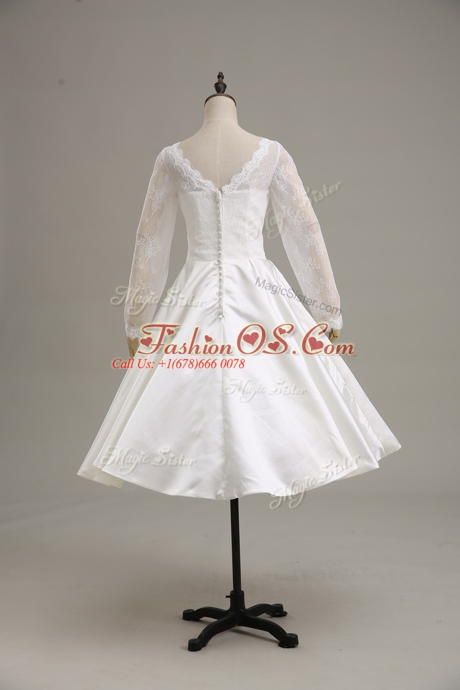 White Ball Gowns Lace and Sashes ribbons Wedding Dress Clasp Handle Satin Long Sleeves Tea Length