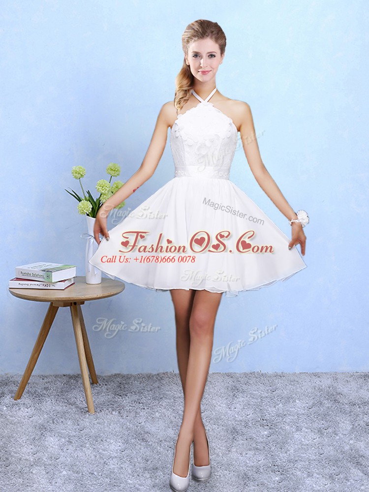 White Chiffon Lace Up Damas Dress Sleeveless Mini Length Lace and Appliques