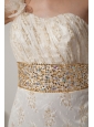 This fabulous floor length prom dress features one rolling flower strap which makes the dress more sassy and romantic.It is made from satin innner layer and features lovely lace outer layer, and a pretty ribbon band around the midsection with lovely rhinestone accents.Lace adds a beauty and charm to a design that other fabrics cannot duplicate. The entire dress has a lace over lay that features a stunning beaded sash design.A unique and highly fashionable formal choice for any occasion.