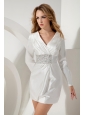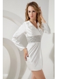 Exquisite and gorgeous white dress dress. The sheathy bodice which flatters the slim line covered with pleates features a v-neck. The long sleeves feature your two arms. Beads work add the charm of the empire waist. The short skirt shows your slim legs. The zipper in the back of the dress secures it in place and makes for easy off and on.