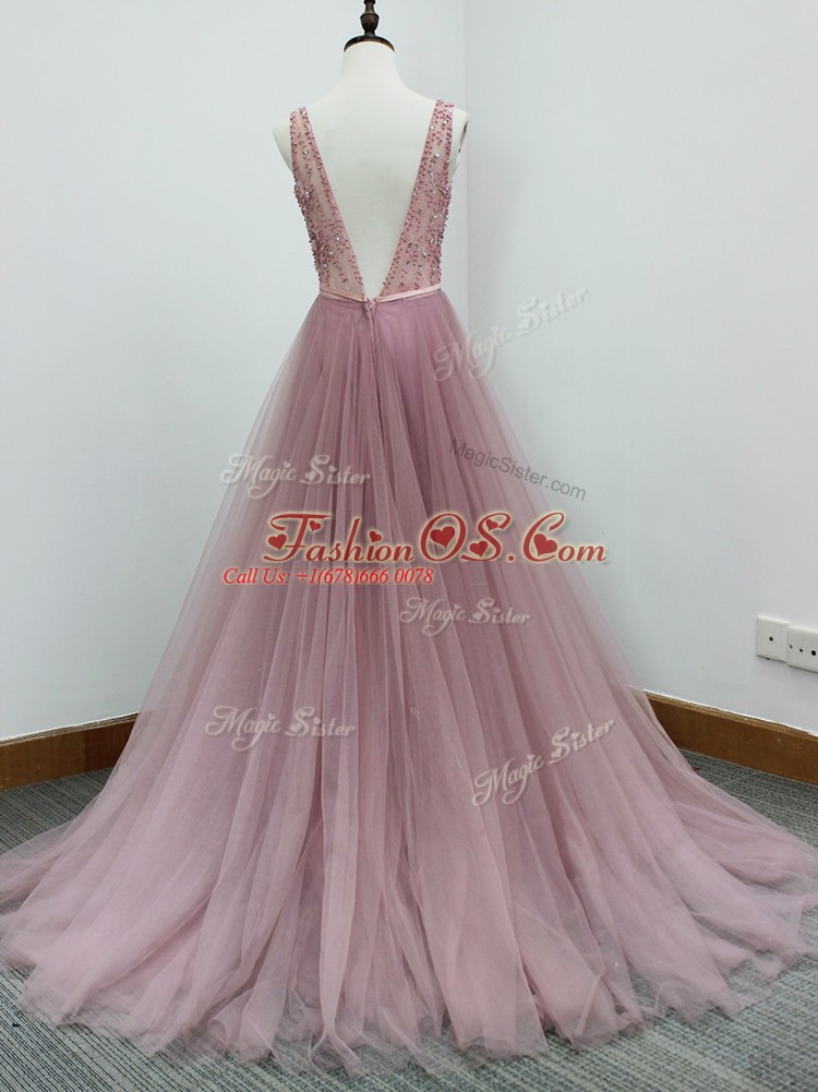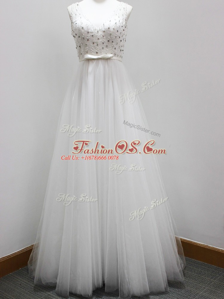 White Dama Dress Prom and Party and Wedding Party with Beading and Belt V-neck Sleeveless Brush Train Zipper