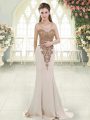 Home >  Prom Dresses >  Unique Prom Dresses > White Elastic Woven Satin Side Zipper Scoop Sleeveless Dress for Prom Sweep Train Beading