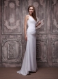 This white prom dress is so exquisite that will make you the most popular one. It features one shoulder with the ruching all over the bodice.The stunning straps in the side of the waist area is adorned with the shimmering beadings and the one sholuder is also embellished with the beadwork.The comfortable skirt flows freely to the floor with the sweep train in the back to completes this luminous design.Bring it to your home, and you will can not wait to attend the prom.