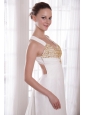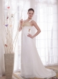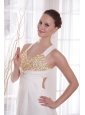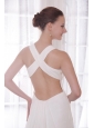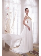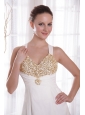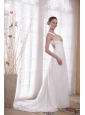 Home >  Prom Dresses >  Modest Prom Dresses > White Empire V-neck Brush Train Chiffon Beading and Rhinestones Prom / Evening Dress