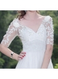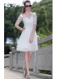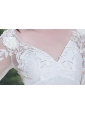 Vogue and elegent!Embellished crystals and flowers adorn the bodice while the special print fabric defining the natural waistline.Your arms are bedecked with the middle-length lace sleeves.The v-line zipper us back completes the look.You will look like the princess when you wear this white short prom gown dress.