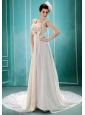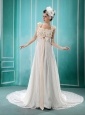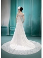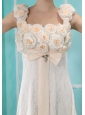 Elegant dresses with moderate designs often make a dramatic impression. This lovely dress is no exception. It features a pretty straps bodice with exquisite hand made flowers which make you sweet and graceful. A lovely bowknot with long ribbons flatter your slim waist.The dress with a cathedral train sways beautifully across the floor when you move, as if you're floating on air. Miss it equal to eclipse your wonderful day!