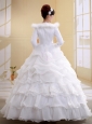 White High-neck Long Sleeves Ball Gown Organza Wedding Dress With Imitated Feather and Lace Decorate