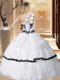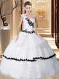 White Organza Lace Up One Shoulder Sleeveless Floor Length Sweet 16 Dress Appliques and Hand Made Flower