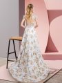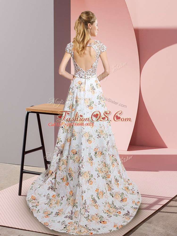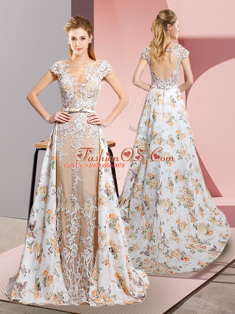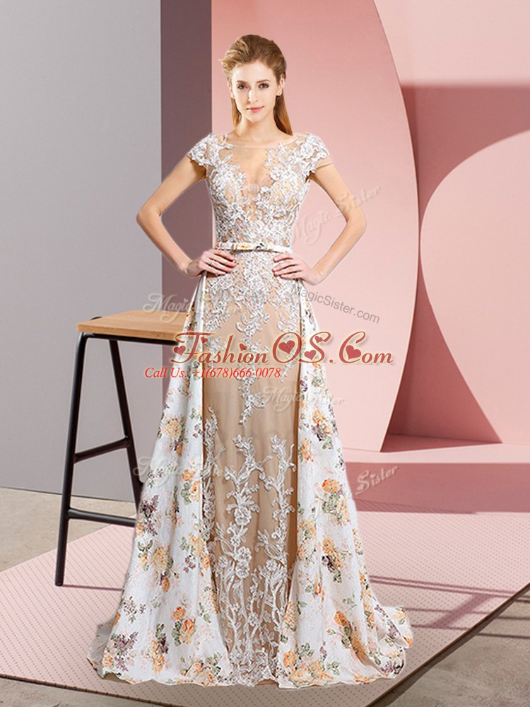White Prom Party Dress Chiffon Brush Train Short Sleeves Lace and Appliques
