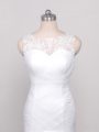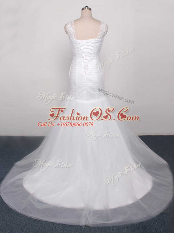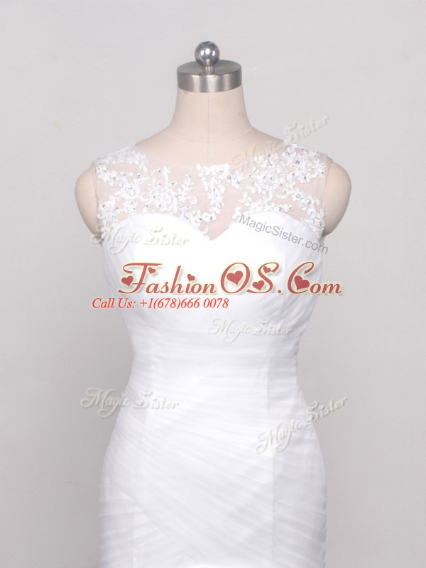 White Tulle Lace Up Scoop Sleeveless Wedding Gown Brush Train Lace and Appliques and Ruching