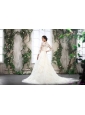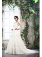 White V Neck Lace Wedding Dresses with Brush Train and Beading