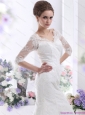 White V Neck Lace Wedding Dresses with  Brush Train and Half Sleeves