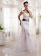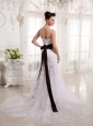 This beauteous dress will make your day one to remember! The pretty sweetheart and lace decorations feature the body-hugging bodice. A sash made in contrasting black color with a bowknot in the back adds fullness to the midsection. A see-through layer of tulle cascades to floor from above the knee. Zipper up back with fasterners with a beautiful sweeping train complete the look.