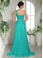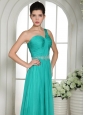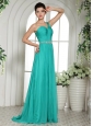 Silhouette: Empire Neckline: One Shoulder Waist: Fitted Hemline/Train: Brush Train Sleeve Length: Sleeveless Embellishment: Beading, Ruch Back Detail: Zipper-up Fully Lined: Yes Built-In Bra: Yes Fabric: Chiffon Shown Color: Turquoise(Color & Style representation may vary by monitor.) Occasion: Prom, Formal Evening, Celebrity, Graduation Season: Spring, Summer, Fall, Winter