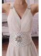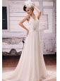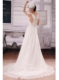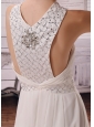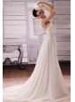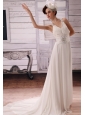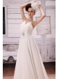 Fashionable and gorgeous this white prom dress is! The whole dress is made from comfortable chiffon fabric and the fitted bodice is accented with straps style and ruchings. The heavily beaded waistband with a defines your natural waistline and reveal your slim figure. The straps are also encruched with beadings. The back of the dress is a special vest style with beads. The beads here, same as the beads on the band, is scattered to form a scaly look. The elegant skirt flows freely to the floor with a graceful sweep trian completes this design. You will get the most attention in your big day.