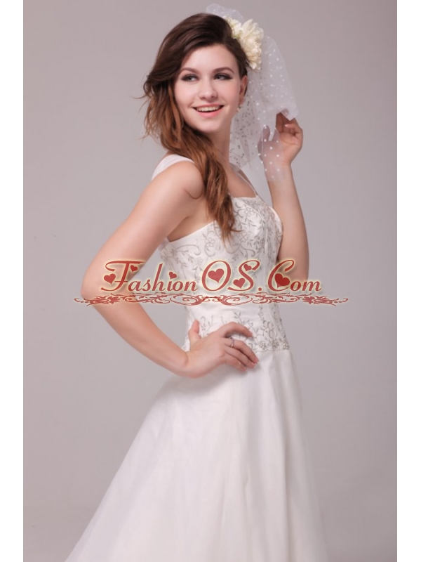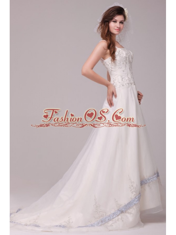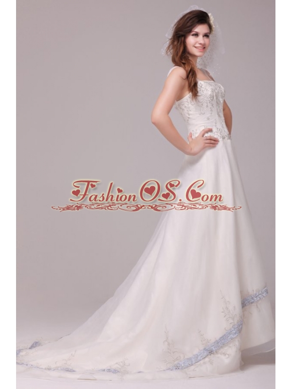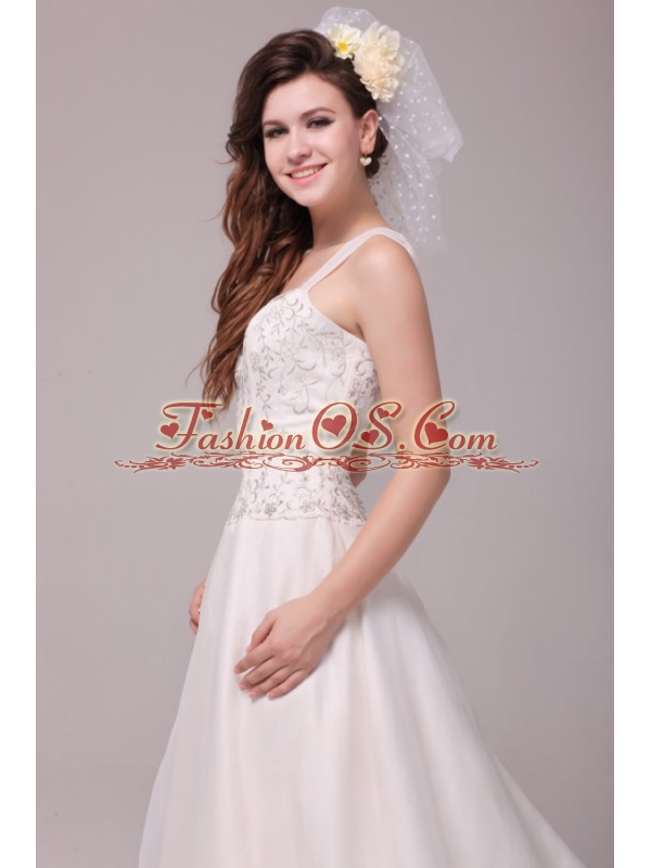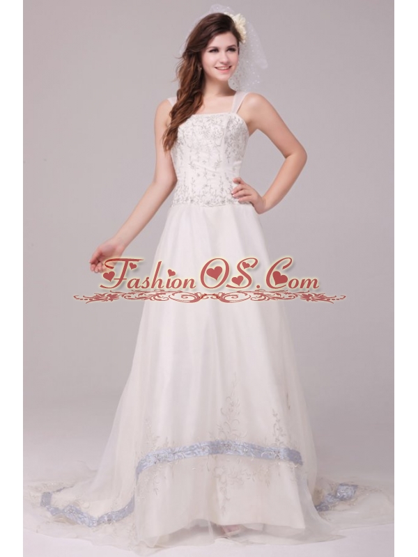 Wide Straps Appliques Decorate Wedding Dress with Court Train