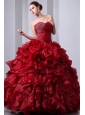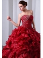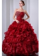 Wine Red A-Line / Princess Sweetheart Beading and Ruffles Quinceanea Dress Floor-length Organza