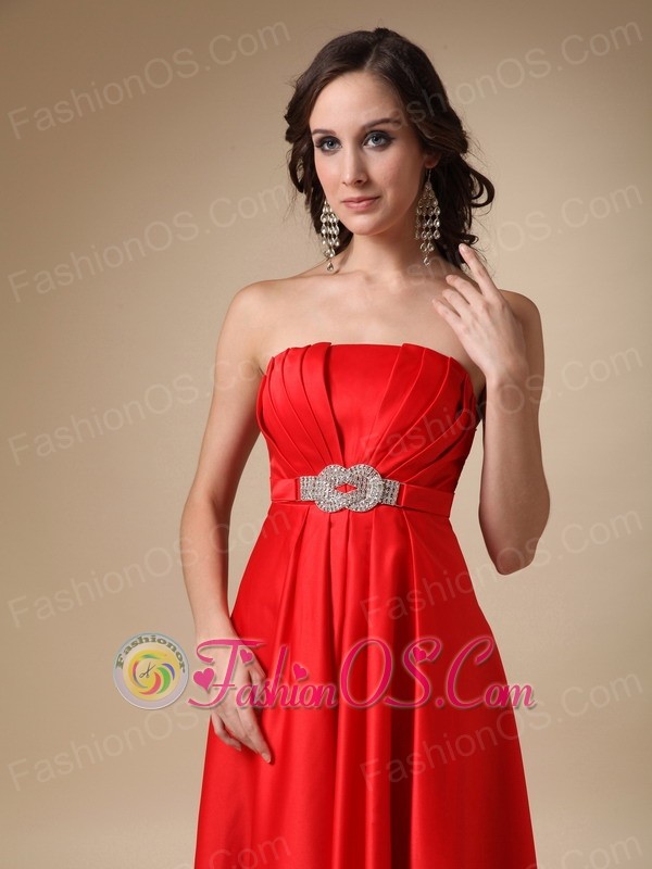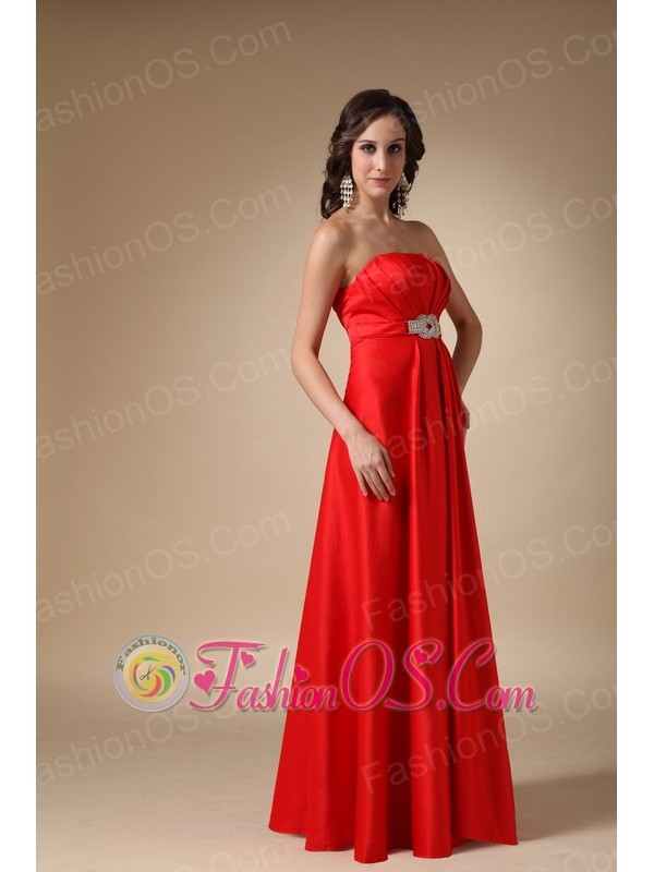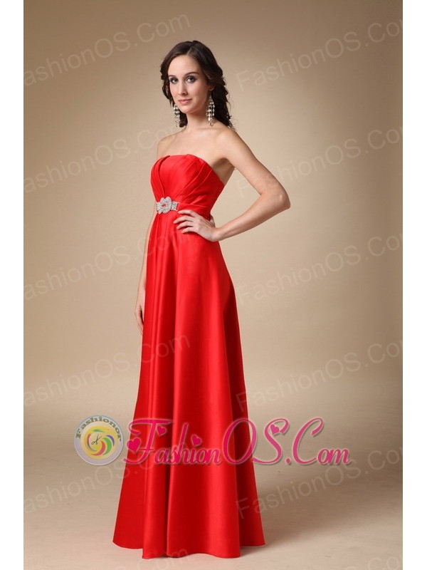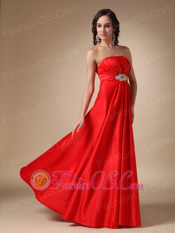 Wine Red A-line Strapless Floor-length Satin Beading Prom Dress