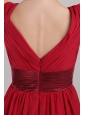 The lovely wine red knee-length prom dress features a V-neck and has two ruched straps. The whole bodice is decorated with ruchings and the waist is emphasized with a ruched waistband and a bow. A zipper up style closure in the back secures the dress in place.