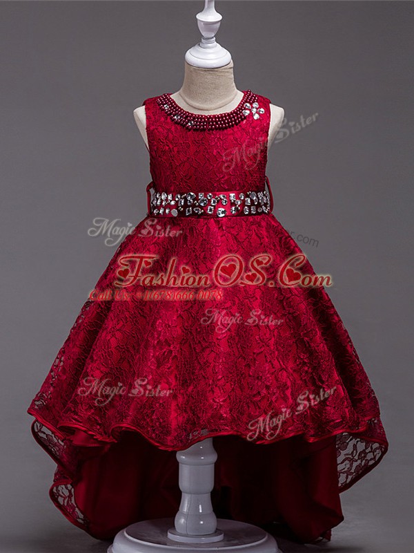 Wine Red Lace Up Little Girls Pageant Dress Beading Sleeveless High Low