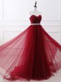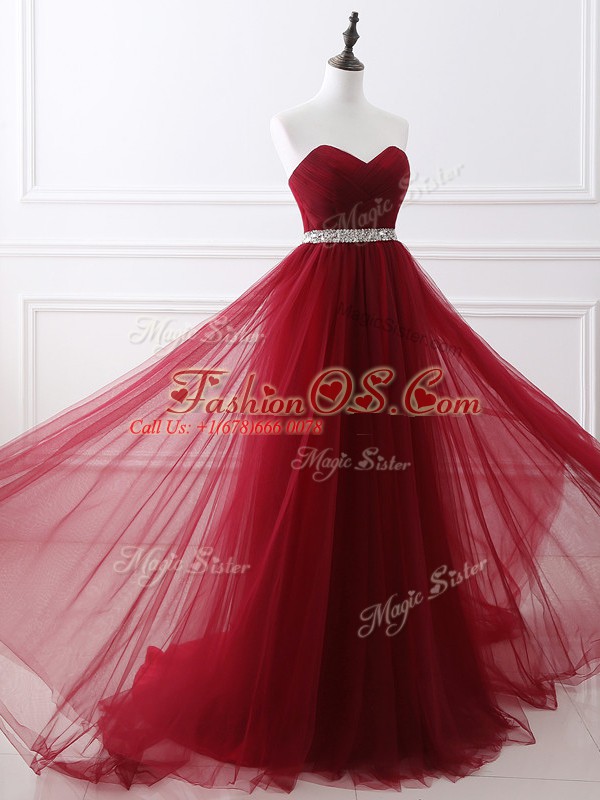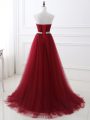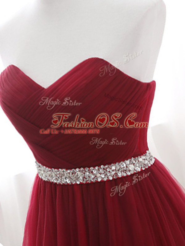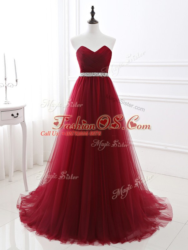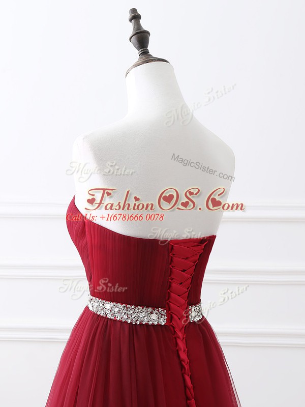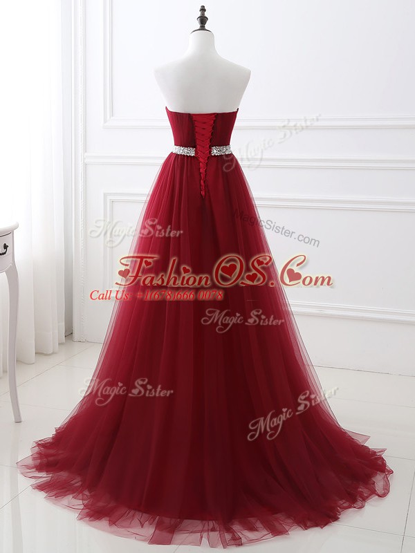 Wine Red Lace Up Party Dress Beading Sleeveless Brush Train