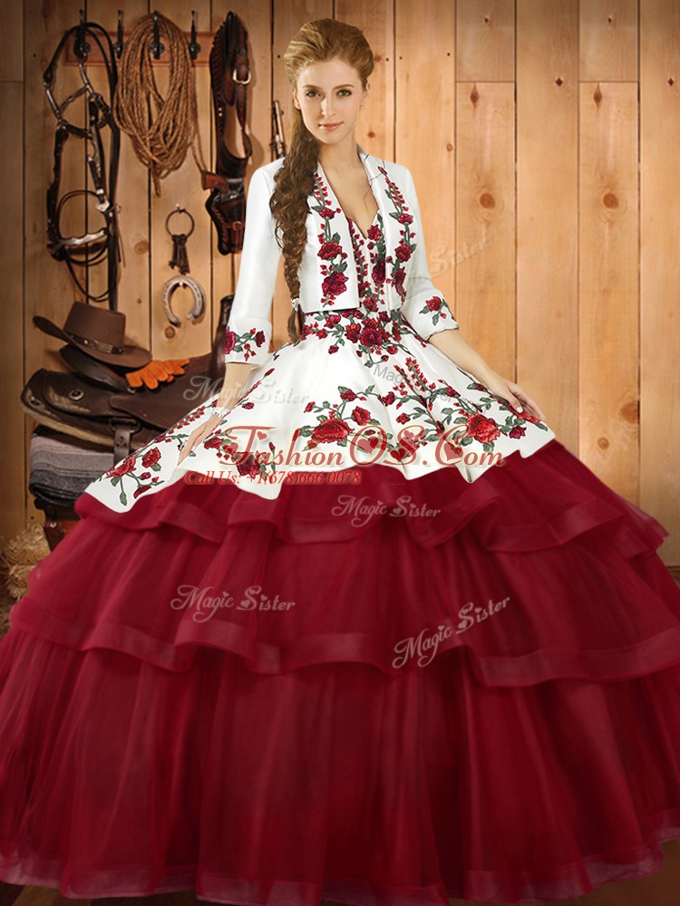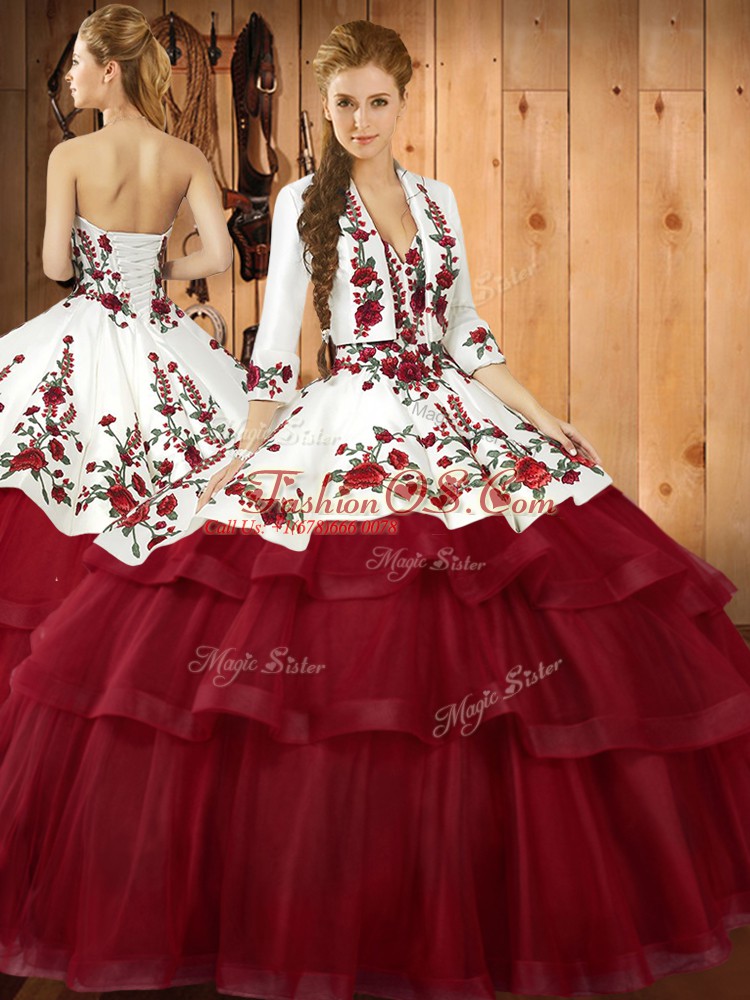 Wine Red Lace Up Sweetheart Embroidery Sweet 16 Quinceanera Dress Organza Sleeveless Sweep Train