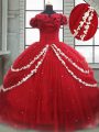 Wine Red Off The Shoulder Lace Up Appliques and Pick Ups Sweet 16 Dress Brush Train Sleeveless