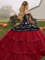 Wine Red Off The Shoulder Lace Up Embroidery and Ruffled Layers Quinceanera Dress Brush Train Sleeveless