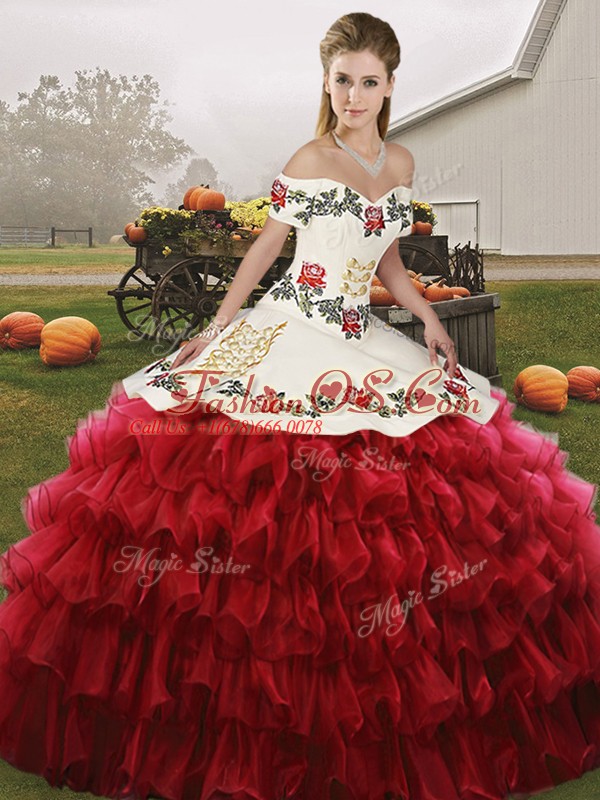 Wine Red Off The Shoulder Neckline Embroidery and Ruffled Layers Quinceanera Dress Sleeveless Lace Up