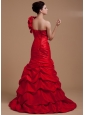 Hot, spicy, sexy are the words that come to mind when seeing this dress. It features one shoulder strap bedecked with hand made flowers and the ruched waist and hip area. The mermaid-style skirt is made from yards and yards of lightweight taffeta material that combine in a beautiful mess of ruffles. A gorgeous lace up closure in the back secures the dress wonderfully and ensures a lovely fit.