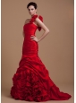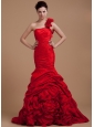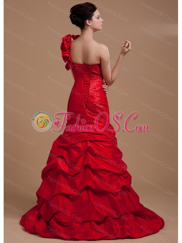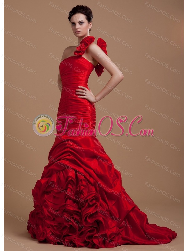 Wine Red Prom Dress With One Shoulder Hand Made Flowers and Ruffled Layers Mermaid Brush Train