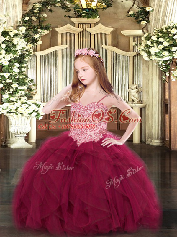 Wine Red Spaghetti Straps Neckline Appliques and Ruffles Little Girl Pageant Gowns Sleeveless Lace Up