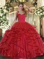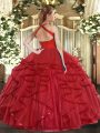 Wine Red Tulle Lace Up Halter Top Sleeveless Floor Length Quince Ball Gowns Ruffles