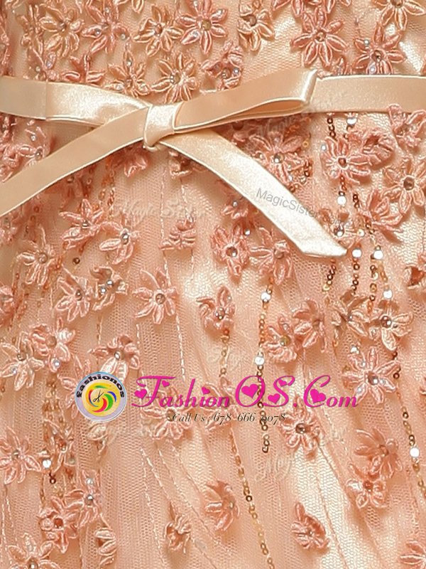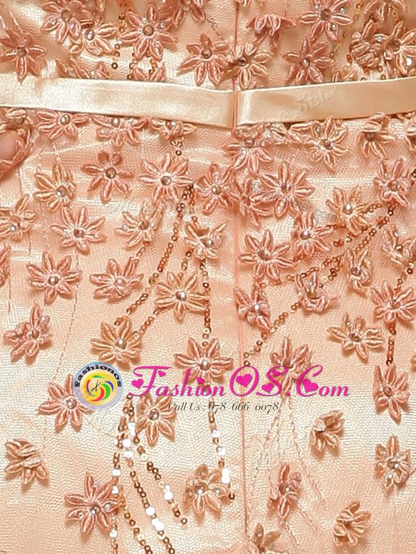 Home >  Prom Dresses >  Perfect Prom Dresses > With Train Peach V-neck Cap Sleeves Brush Train Zipper