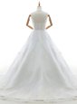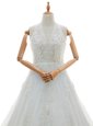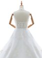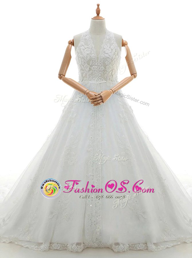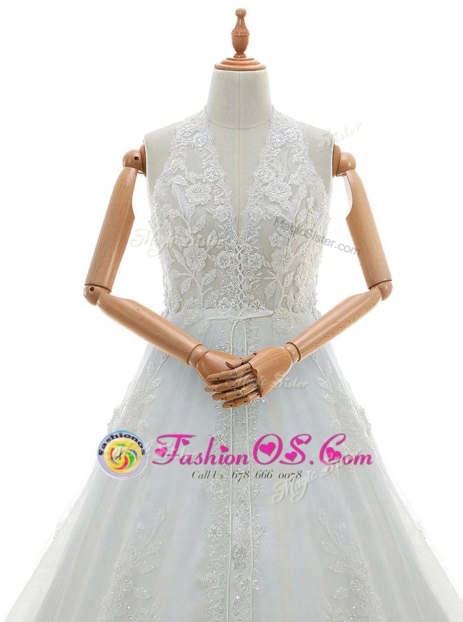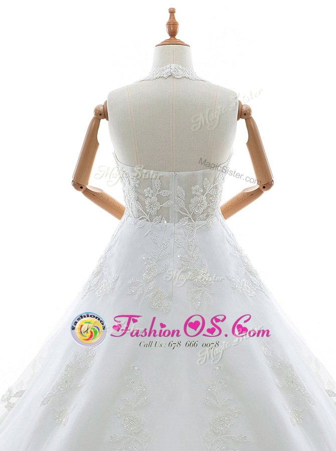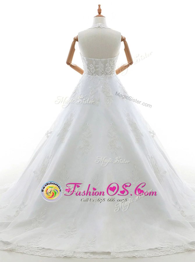 With Train White Wedding Dress Lace Brush Train Sleeveless Appliques