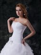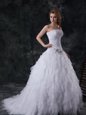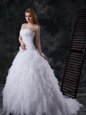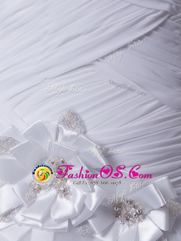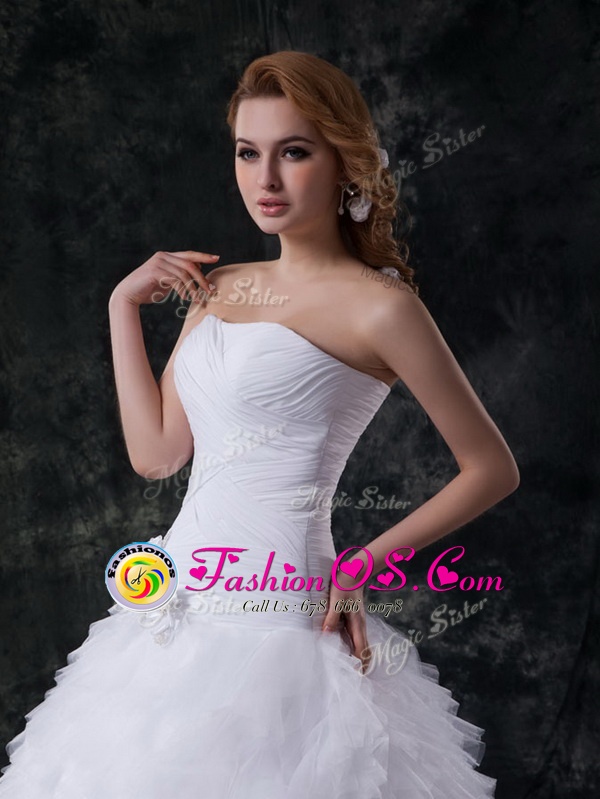 Home >  Wedding Dresses >  Fashionable Wedding Dresses > With Train White Wedding Dress Tulle Brush Train Sleeveless Beading and Ruffles and Ruching and Hand Made Flower