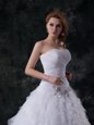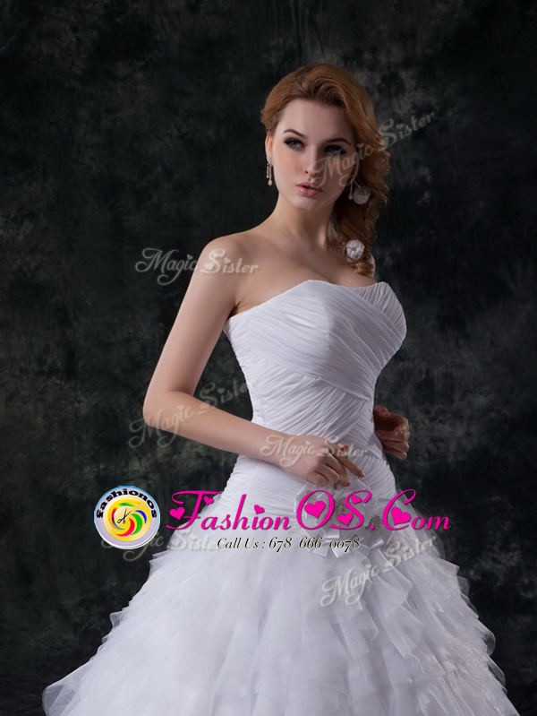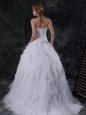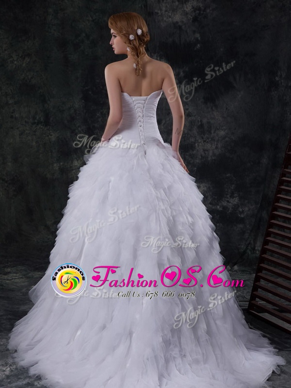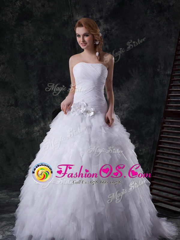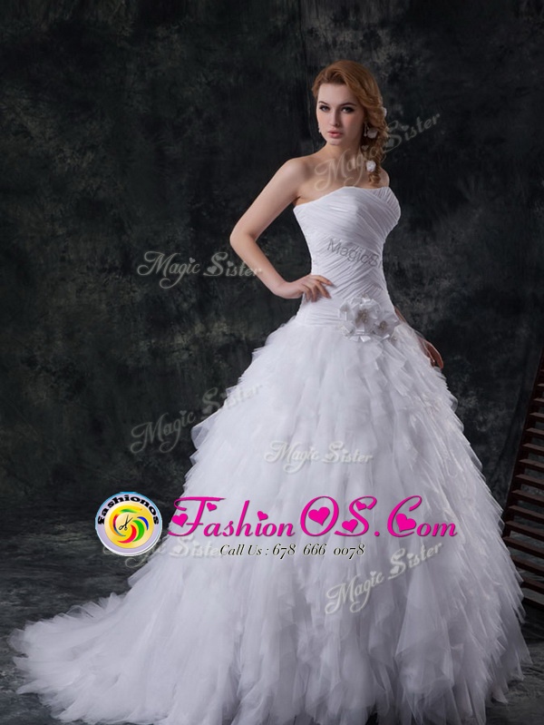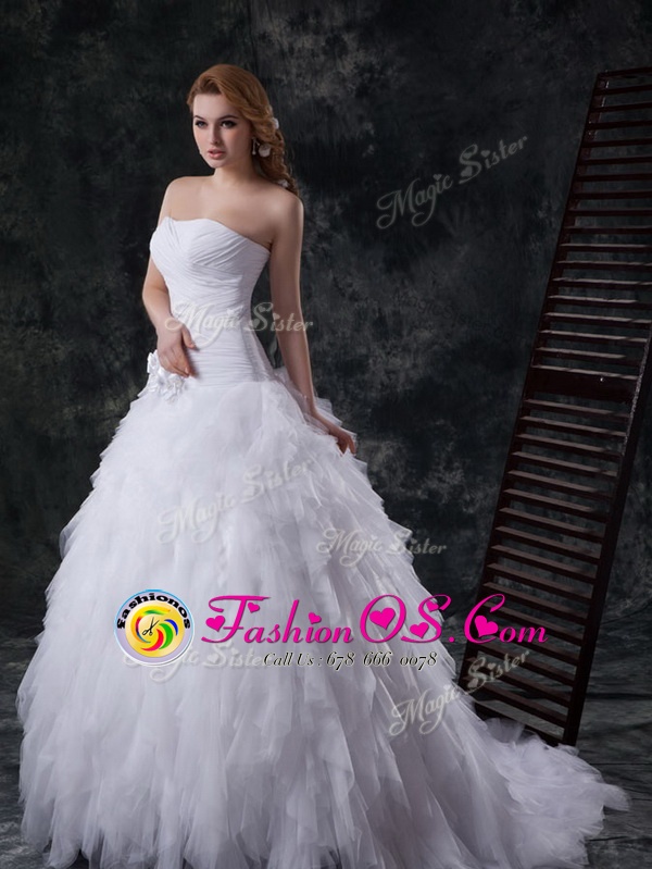 With Train White Wedding Dress Tulle Brush Train Sleeveless Beading and Ruffles and Ruching and Hand Made Flower